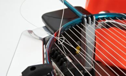 穿横线过程中要注意理线,穿一根理一根,切勿在球线都穿好之后才开始理线,这个是有区别的。在每根横线被拉力头拉紧的同时,把横线捋直,可以减少一些来至竖线的摩擦阻力,使横线拉得更紧。据权威机构测试结果表明,这种方法在电脑穿线机上会提高约6%的张力,在手动机上提高月3%的拉力。换而言之,你用55磅的拉力拉出来的横线,效果会相当于别人用58、59磅拉出来的。我们可以直接用手指完成这项工作,也可以用离线椎来整理球线。当然我们把最后的横线打完结了,还需要再次整理球线,使得每条横竖线更加笔直,确保击球时更加坚固稳定,而且给顾客一个良好的印象。