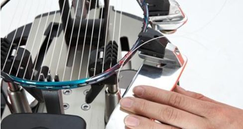 松开起始夹,然后把球线绕到拍喉第7个孔处打结尾结。打结时需要注意在拉紧线头的时候,先松开座夹的底座锁定装置,再松开座夹的线夹,可避免在松线夹时当出现回线的情况,线夹内侧凹凸不平的表面会划伤球线。