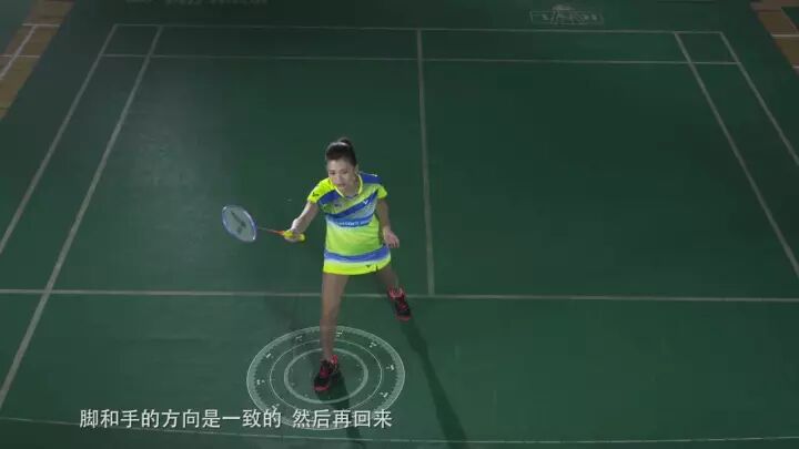 2、上网动作:左脚蹬地,右脚跨步上网,重心前移至右脚,手臂伸直,脚和手的方向一致,准备击球;