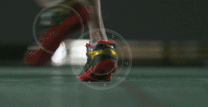 利用蹬转传递的力量加速挥拍的过程,到击球时速度最大,同时在击球瞬间,握紧球拍,外旋变成内旋发力。转动身体的同时,重心由右脚转换到左脚上去。