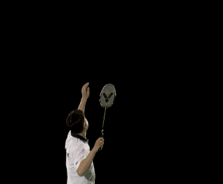 4、击球时,右前臂向前上方由内旋带动手腕突然回收发力挥拍形成鞭打,击球托的后部使球过网。