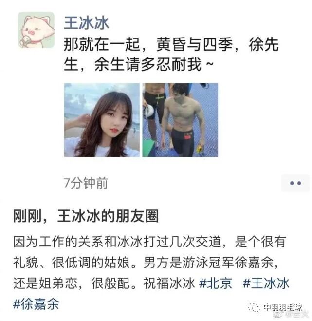 北京时间7月20日,中央电视台美女主播王冰冰通过朋友圈官宣与游泳世界冠军徐嘉余恋爱的截图被曝光,引发网友们强烈关注。
