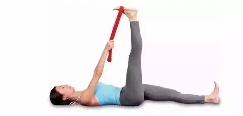 4. 伸腿运动:平躺,膝盖弯屈,脚平放于地。伸出左腿,套入伸缩拉带或毛巾,双手抓住拉带两端。用拉带把腿拉向胸前,再用力将小腿伸直,保持10至30秒,以锻炼小腿肌肉和脚筋。重复该动作3至5次,然后换腿。