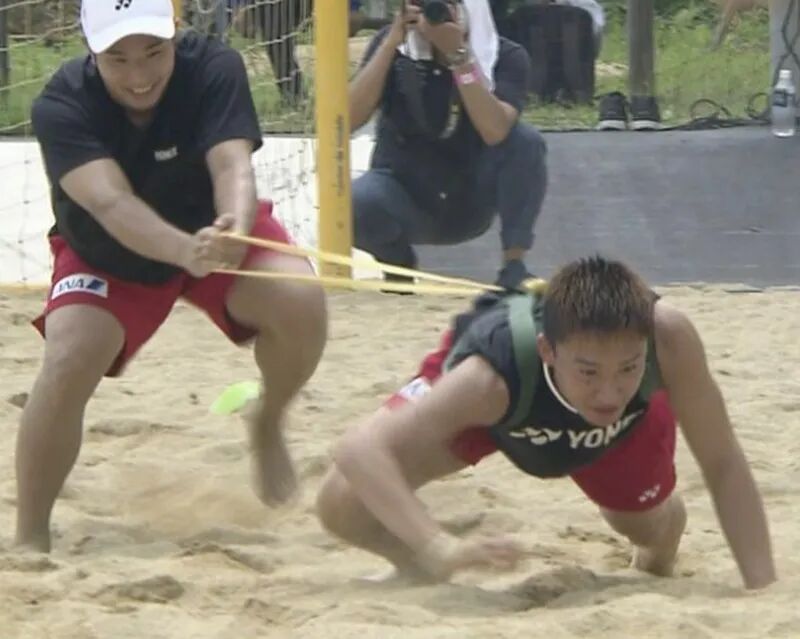 根据日本电视台NTV的报导指出,日本国家队在沙滩上以四人一组进行10公尺的快速冲刺项目,还出现桃田贤斗与奥原希望同组对决的场景。平常不会对到的两人进行梦幻对决,才刚开始,桃田贤斗就被沙子耽误了。奥原希望率先跑到终点,并开心摆出POSE。