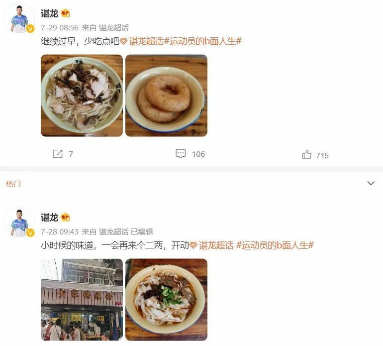 回到家乡,谌龙自然不会忘记品尝当地美食,他连续两天晒出自己“过早”的照片。吃一碗米粉,谌龙直呼:“小时候的味道,一会再来个二两,开动!”第二天早上换种花样吃吃,谌龙表示:“继续过早,少吃点吧!”十多岁就离开家乡的谌龙趁着这个机会,找到了小时候的味道。