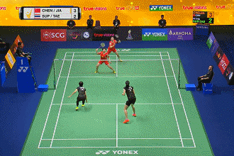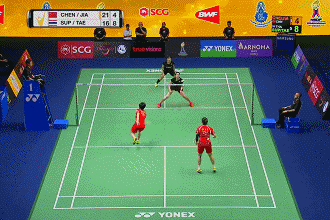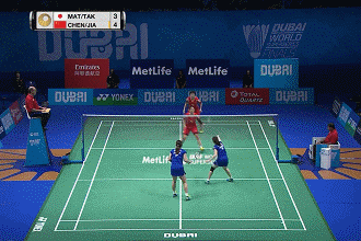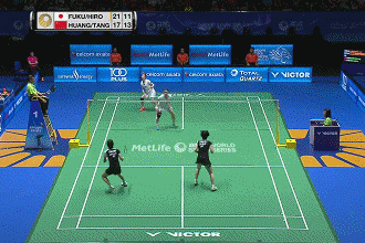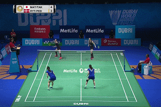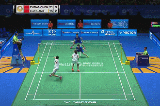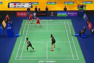 对手起高球,我方就该转入进攻。虽然进攻并不意味着要杀球,但一定要形成前封后攻的站位