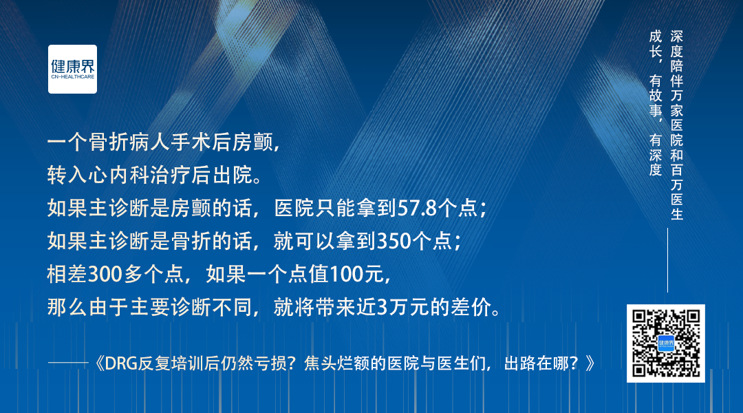 例如,一个骨折的病人,手术之后发生了房颤,转入心内科治疗后出院。如果主诊断是房颤的话,只能拿到57.8个点;如果主诊断是骨折的话,就可以拿到350个点;相差300多个点,如果一个点值100元,那么由于主要诊断不同,就将带来近3万元的差价。