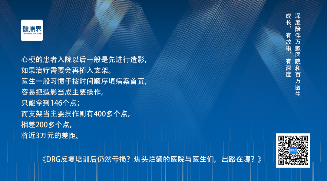 「医生一般习惯于按时间顺序填病案首页,这样就很容易把造影当成主要操作,只能拿到146个点;而支架当主要操作则有400多个点,相差200多个点,又是将近3万元的差价。」