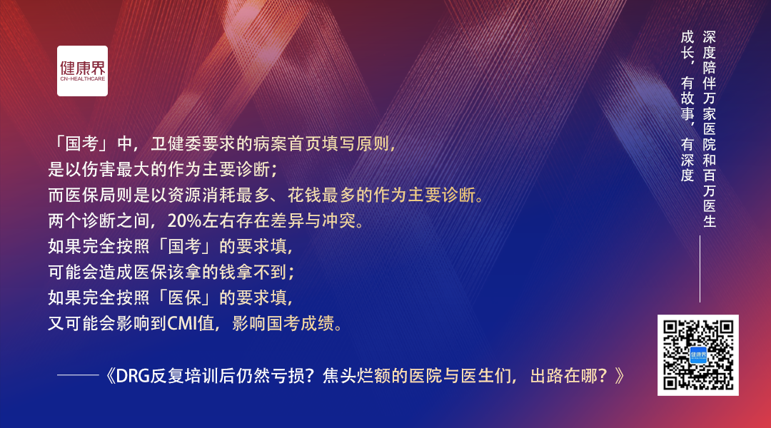 「两个诊断之间,80%左右基本是一致的,但是20%左右也存在差异与冲突。」操乐勤说道,如果完全按照「国考」的要求填,可能会造成医保该拿的钱拿不到;如果完全按照「医保」的要求填,又可能会影响到CMI值,影响国考成绩。