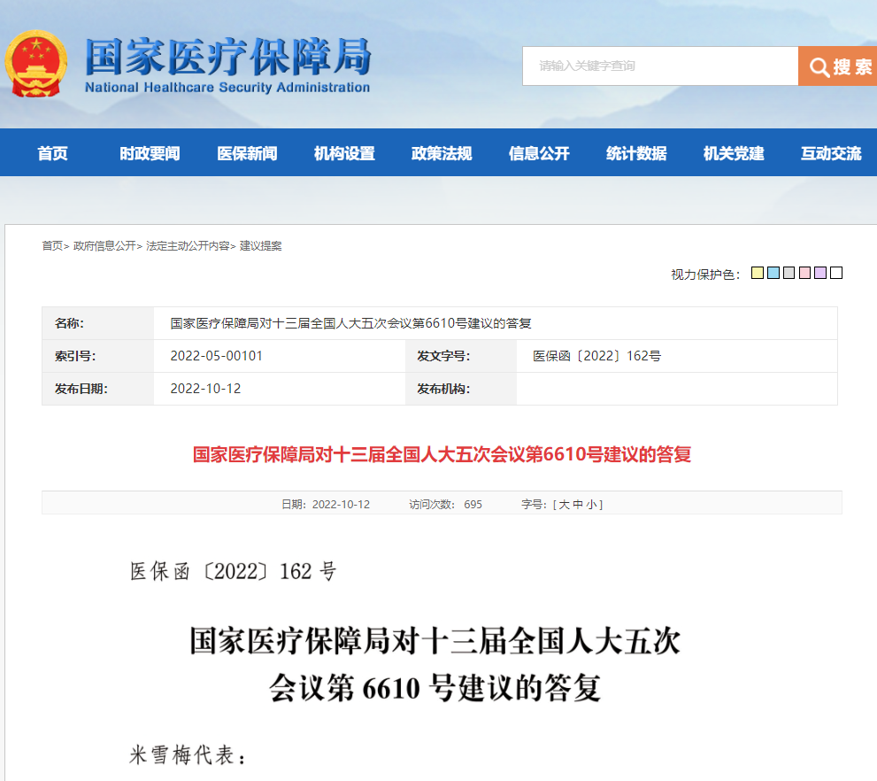 「越来越多的医务人员和患者反映,医保药品支付范围限定逐渐成为影响临床合理用药、甚至引发医患纠纷的重要因素。」2022年10月12日,国家医保局官网发布了对全国人大代表米雪梅提出的议案的答复。