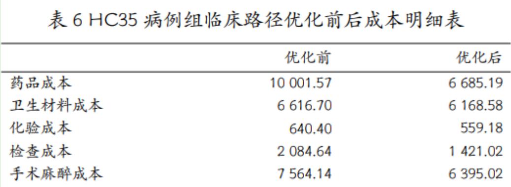 以DRG某病组(HC35)为例,通过临床路径对诊疗行为进行优化之后,病组成本由原来的30000降至20000多,其中药品成本由10000降至6000多、检查成本由2000多降至1000多、手术麻醉成本由7000多降至6000多。