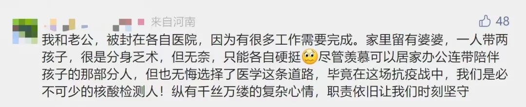 她表示,尽管羡慕可以居家办公连带陪伴孩子的那部分人,但也无悔选择了医学这条道路,「毕竟在这场抗疫战中,我们是必不可少的核酸检测人!纵有千丝万缕的复杂心情,职责依旧让我们时刻坚守。」
