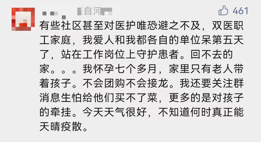 「双医职工家庭,我爱人和我都在各自单位呆第五天了,在工作岗位上守护患者。回不去的家,我怀孕七个多月,家里只有老人带着孩子,不会团购、不会接龙,我还要关注群消息,生怕给他们买不了菜,更多的是对孩子的牵挂。」10月22日,一名医务人员在金水路7号微信公众号留言说。