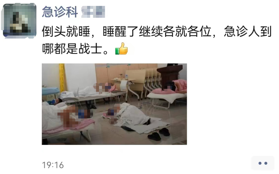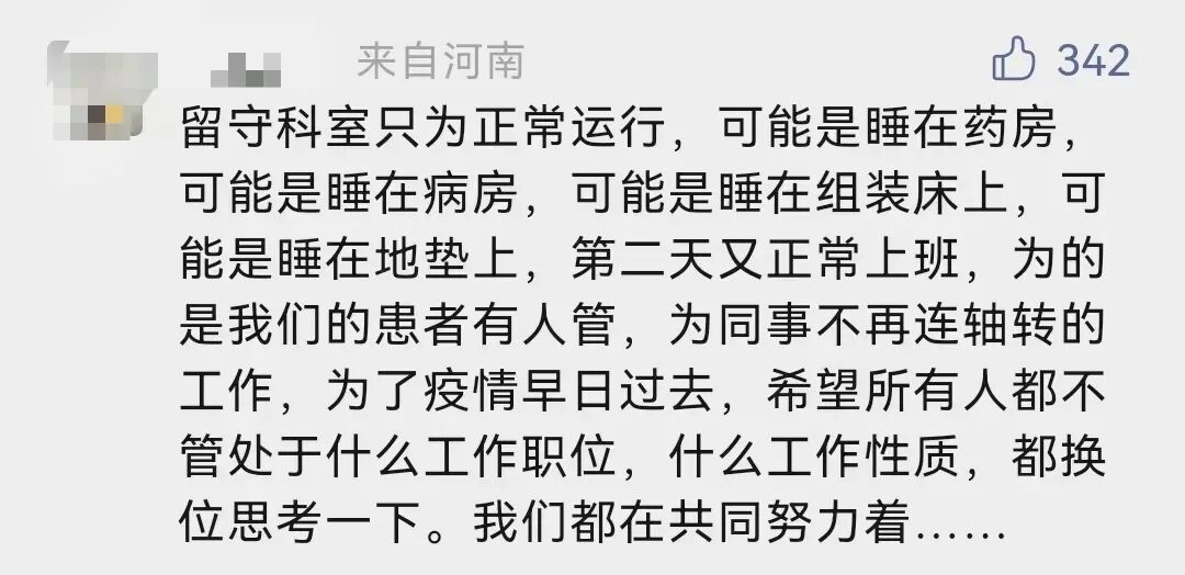 「留守科室只为正常运行,可能是睡在药房,可能是睡在病房,可能是睡在组装床上,可能是睡在地垫上,第二天又正常上班。」一名医务人员留言表示,「为的是我们的患者有人管,为同事不再连轴转工作。」