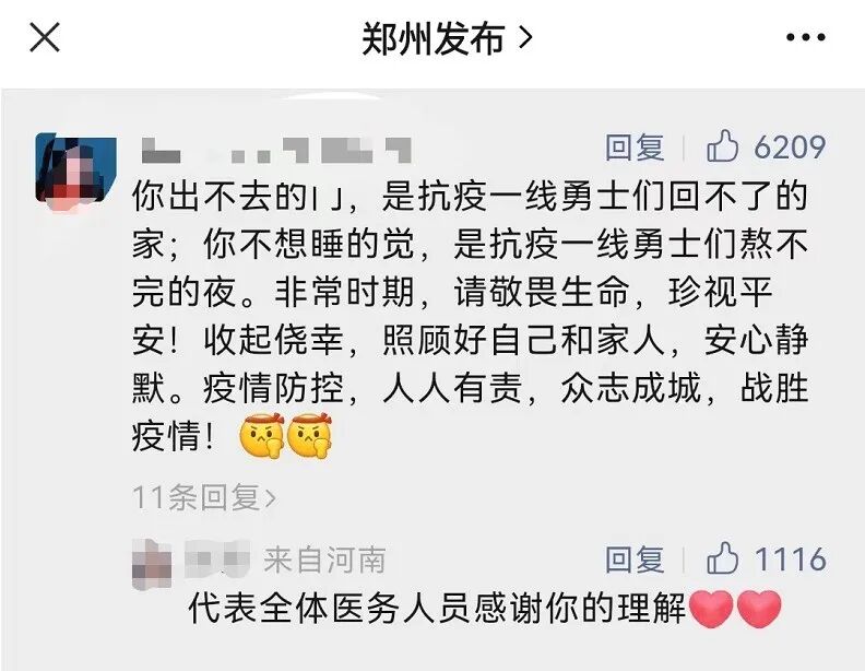 「你出不去的门,是抗疫一线勇士们回不了的家;你不想睡的觉,是抗疫一线勇士们熬不完的夜。」在郑州市委、市政府新媒体权威发布平台「郑州发布」10月20日发布的一则通告下面,这条留言获得了6000多的点赞。