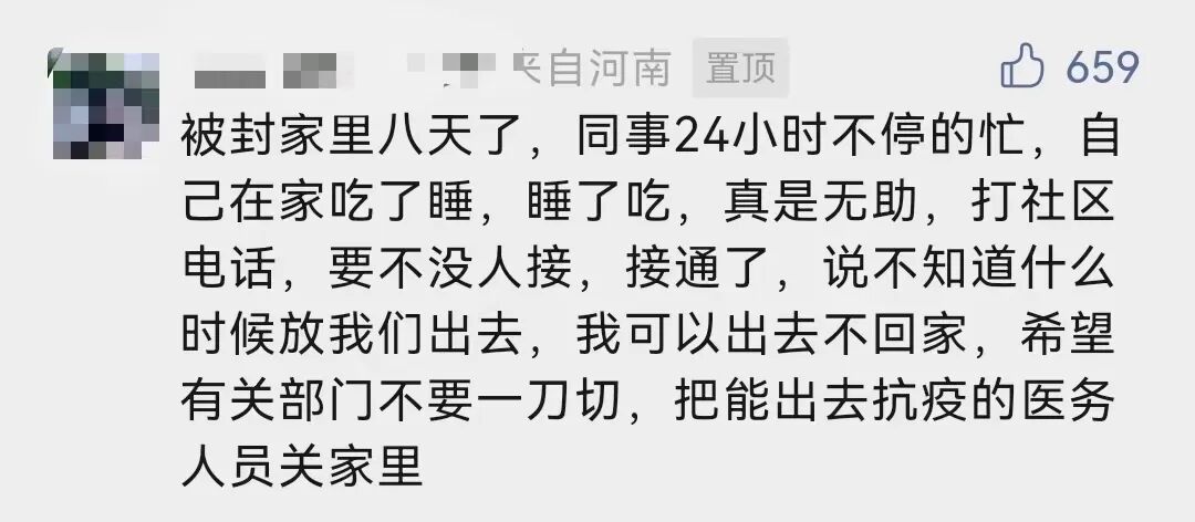 「被封家里八天了,同事24小时不停地忙,自己在家吃了睡、睡了吃,真是无助。打社区电话,要不没人接,接通了,说不知道什么时候放我们出去。我可以出去不回家,希望不要一刀切,把能出去抗疫的医务人员关家里。」10月22日,一名医务人员在金水路7号微信公众号留言说。