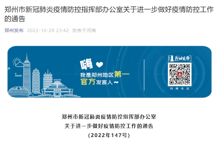 郑州全面升级疫情防控举措是从10月20日开始的。根据「郑州发布」推送的《郑州市新冠肺炎疫情防控指挥部办公室第147号通告》:鉴于当前全市多点散发、局部聚集性疫情仍有发生,为尽快阻断病毒传播链条,以最快速度圈住封死捞干扑灭疫情,坚决打赢疫情防控阻击战,10月21日、22日、23日持续开展核酸检测;