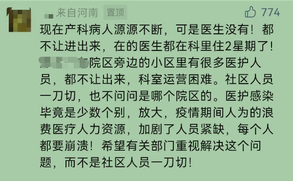 10月22日,一名医护人员在金水路7号微信公众号留言表示,现在(医院)产科病人源源不断,可是医生没有!(小区)都不让出来,在的医生都在科里住2星期了!