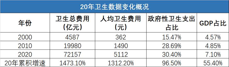 从2000年到2020年期间,我国卫生总费用和人均卫生费用的累积增速,接近15倍,「增速是吓人的」。GDP的占比也从4.57%到了7.1%,提高超过50%。