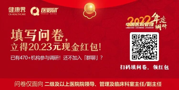 扫描上方二维码或点击【阅读原文】进行问卷填报!本次调研采取面向特定人群(二级及以上医院院领导、管理及临床科室主任/副主任)有奖问答的形式,完成问卷赠送现金红包(20.23元)、价值128元健康界会员1个月使用权益或价值96元健康界新书《航标》(三级公立医院绩效考核优秀案例)1本(三选一,五个工作日内发放奖励)问卷填报大约需要10分钟。