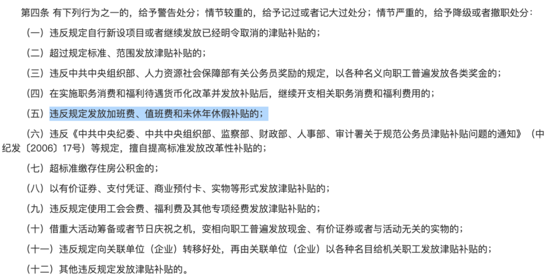 根据监察部、人社部、财政部、审计署于2013年《违规发放津贴补贴行为处分规定》第四条明确提出:「违反规定发放加班费、值班费和未休年假补贴的」。