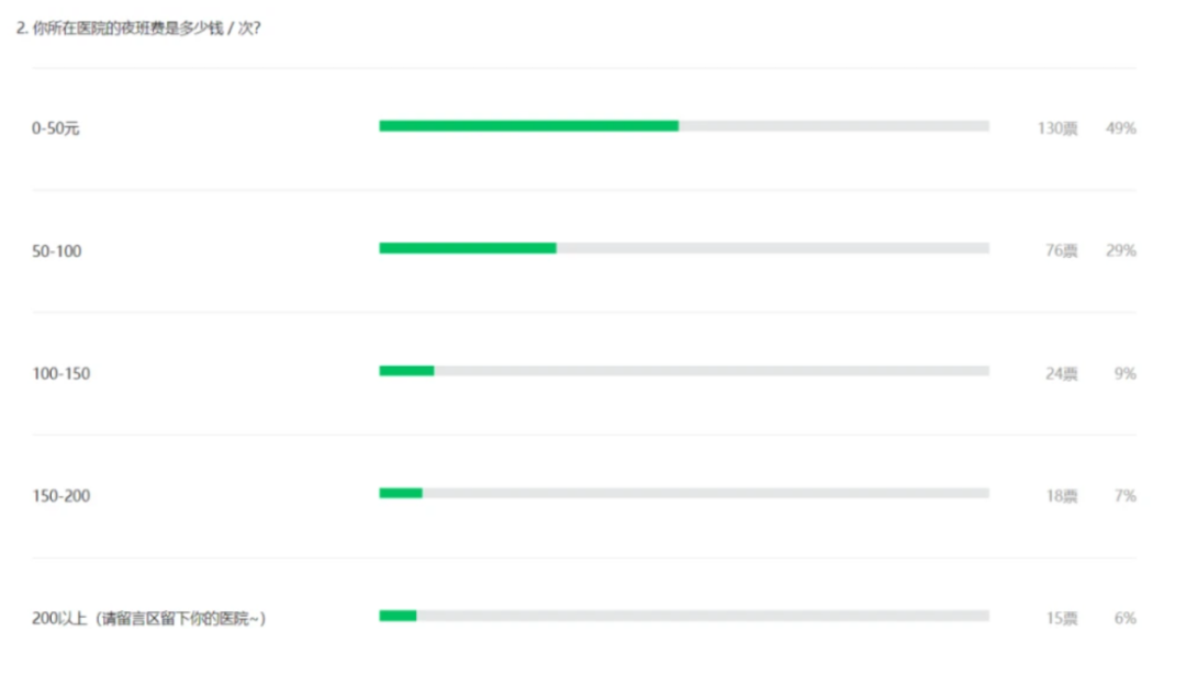 某平台曾经发起过关于检验科夜班费用的投票,参与投票的有263人,49%的人夜班费少于50元,29%的人夜班费在50~100元。