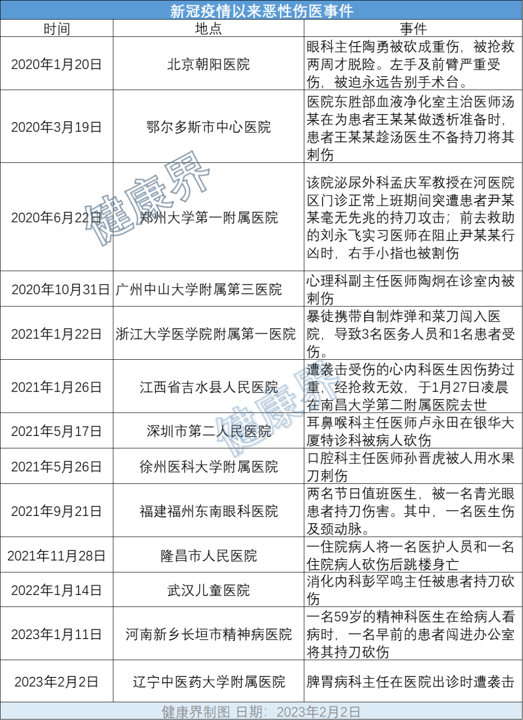 更加令人心痛的是,新冠疫情三年以来,医务人员身心压力陡增。然而,恶性伤医事件却一再发生。据健康界不完全统计,三年来伤医事件已经10余起。