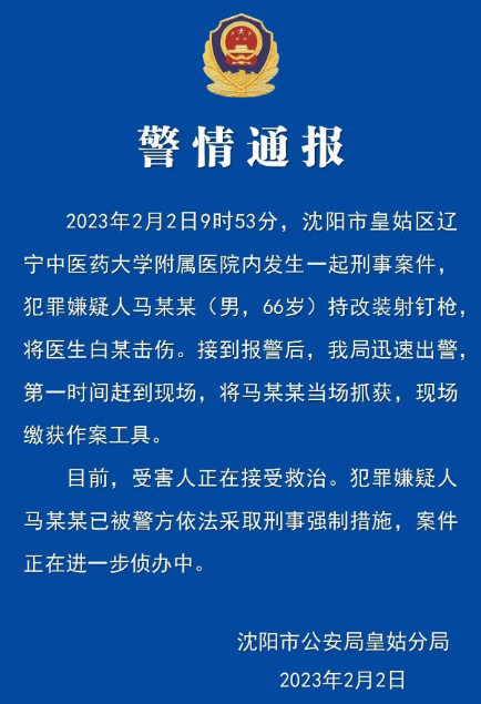 2月2日晚,辽宁省沈阳市公安局皇姑分局发布警情通报称,当日上午,辽宁中医药大学附属医院内发生一起刑事案件。66岁的犯罪嫌疑人马某某持改装射钉枪,将医生白某击伤。马某某当场被抓获,目前受害医生正在接受救治。