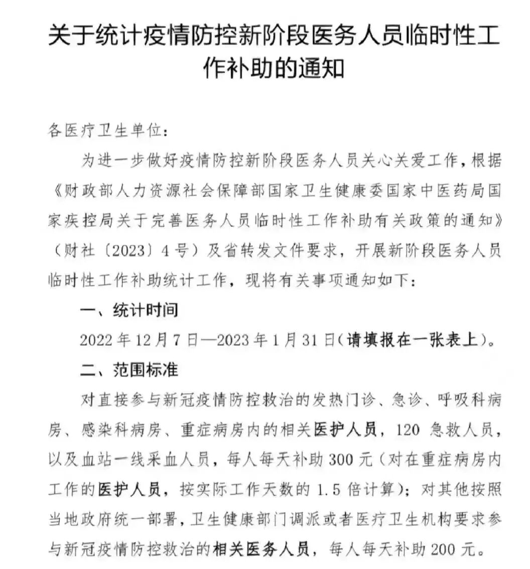 近期,财政部、人社部、国家卫生健康委、国家中药局、国家疾控局共同下发《关于完善医务人员临时性工作补助有关政策的通知》(财社(2023)4号),要给这两个月以来奋战在抗疫一线的医护人员发放补贴,统计时间为2022年12月7日-2023年1月31日。