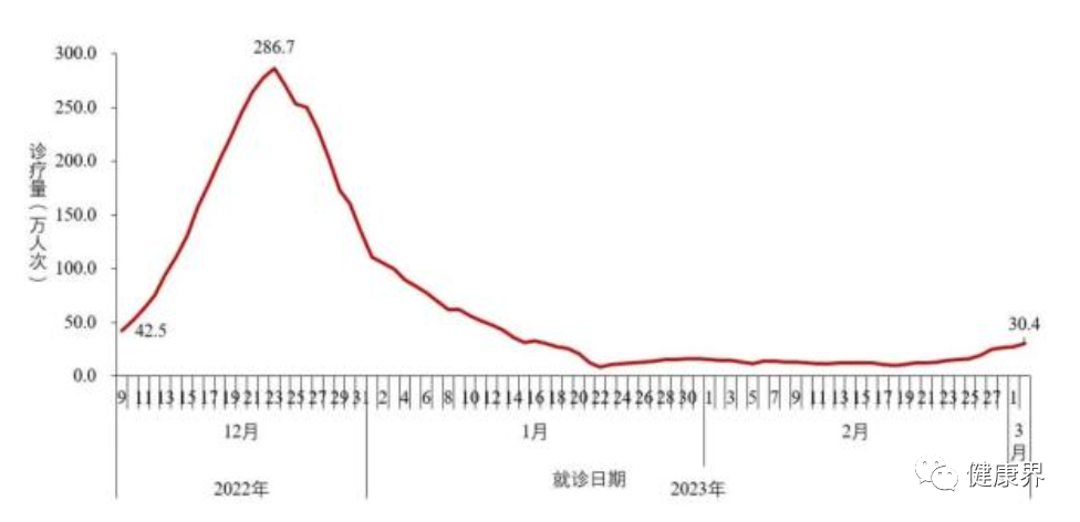 尽管华中科技大学同济医学院附属同济医院感染科主任医师邢铭友在接受媒体采访时分析称,第二轮感染高峰可能会在3-5月到来,但根据中疾控3月4日发布的数据,全国(不含港澳台)发热门诊(诊室)就诊人数于2022年12月23日达到峰值286.7万人次,随后连续下降;2023年1月23日后就诊人数呈现低位波动,近1周(2月24日-3月2日)有所增加,3月2日为30.4万人次,较峰值下降了89.4%。
