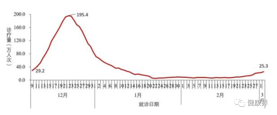 全国城市发热门诊(诊室)就诊人数变化趋势说明:城市发热门诊诊疗量含二级以上医疗机构和社区卫生服务中心(不含社区卫生服务站)。