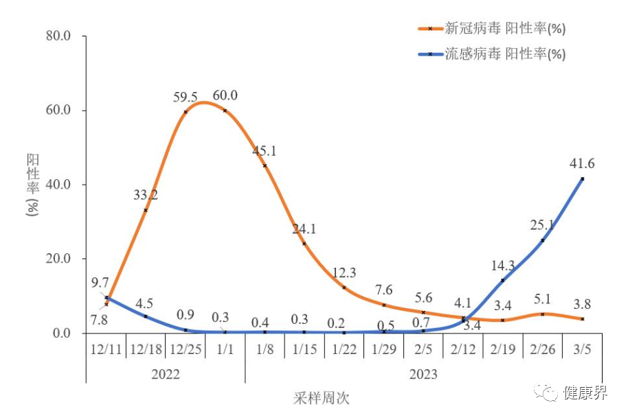 3月11日晚,中国疾病预防控制中心发布全国新型冠状病毒感染疫情情况:2022年12月9日以来,各省份报告人群新冠病毒核酸检测阳性数及阳性率呈现先增加后降低趋势,阳性人数12月22日达到高峰(694万)后波动下降,3月9日降至7786;检测阳性率12月25日达高峰(29.2%)后波动下降,3月9日为1.0%;与此同时,在2月5日至3月5日的28天内,流感病毒阳性率从0.7%激增到了41.6%,翻了近60倍。