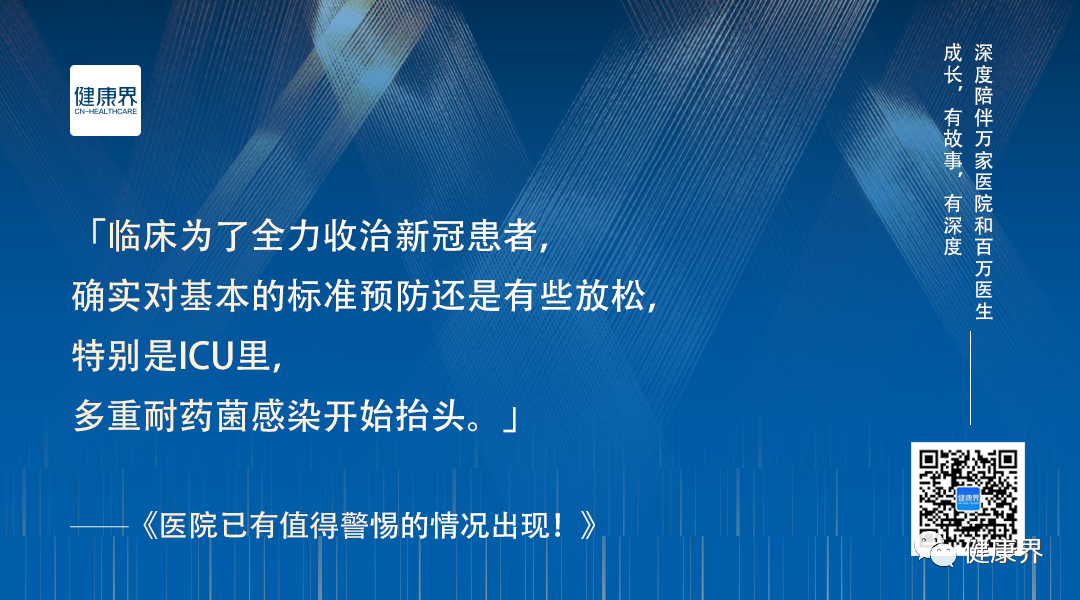 「临床为了全力收治患者,确实对基本的标准预防还是有些放松,特别是ICU里,多重耐药菌感染开始抬头。」青海大学附属医院副院长、公共卫生和医院感染管理部主任张永栋同样如此对健康界说。