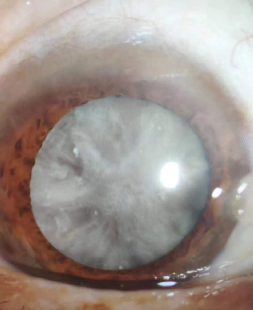 (图1,张大爷的晶状体浑浊,白内障十分严重,视力只能看到手动。)