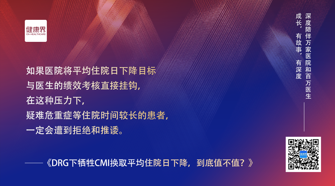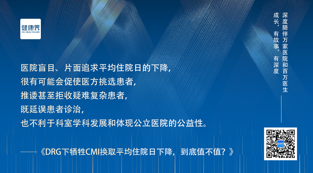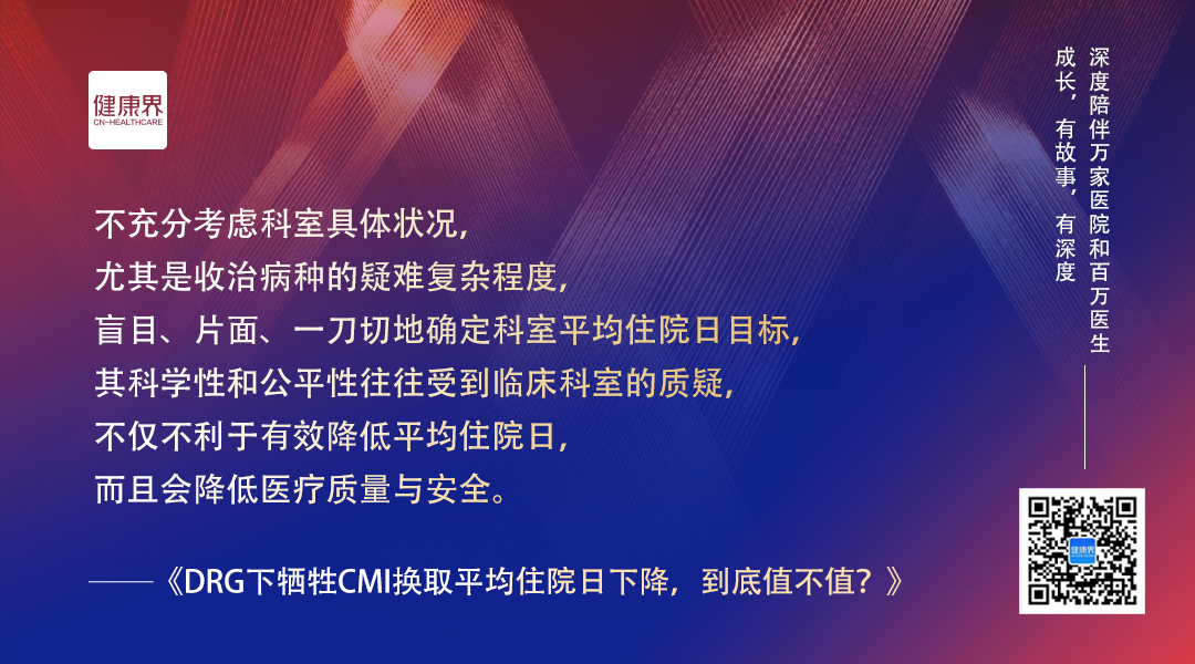 「尤其需要注意,不能把平均住院日考核目标与医生的绩效挂钩。得让医生能心无旁骛地看病救人。」浙大二院甲状腺外科主任王平对健康界说道。(见报道《DRG下牺牲CMI换平均住院日下降,到底值不值?》)