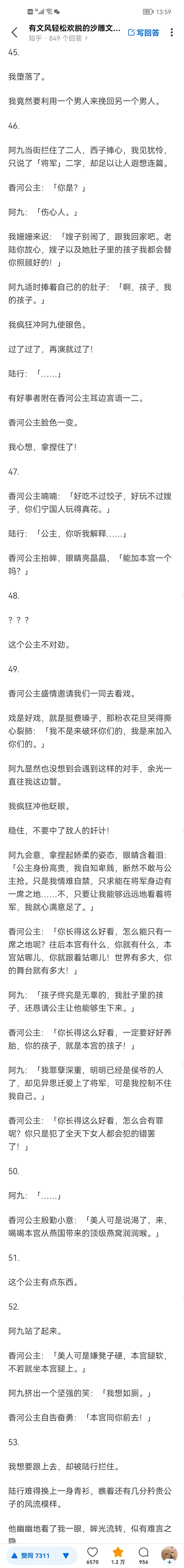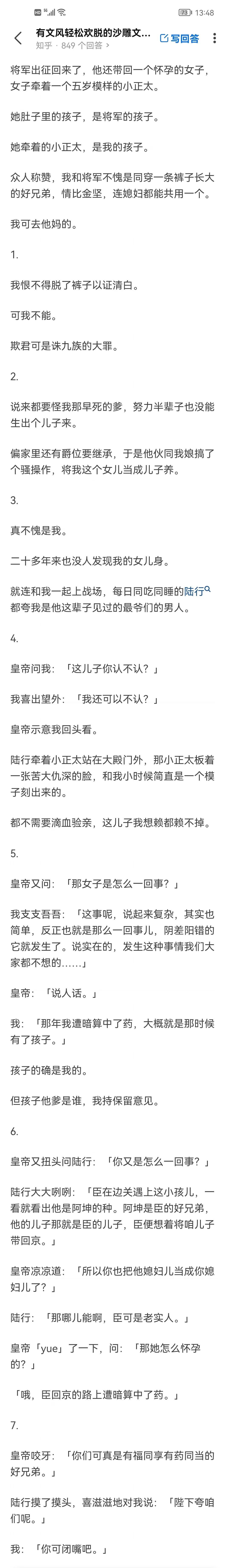 将军出征回来了,他还带回一个怀孕的女子,女子牵着一个五岁模样的小正太。她肚子里的孩子,是将军的孩子。她牵着的小正太,是我的孩子。众人称赞,我和将军不愧是同穿一条裤子长大的好兄弟,情比金坚,连媳妇都能共用一个。我可去他妈的。