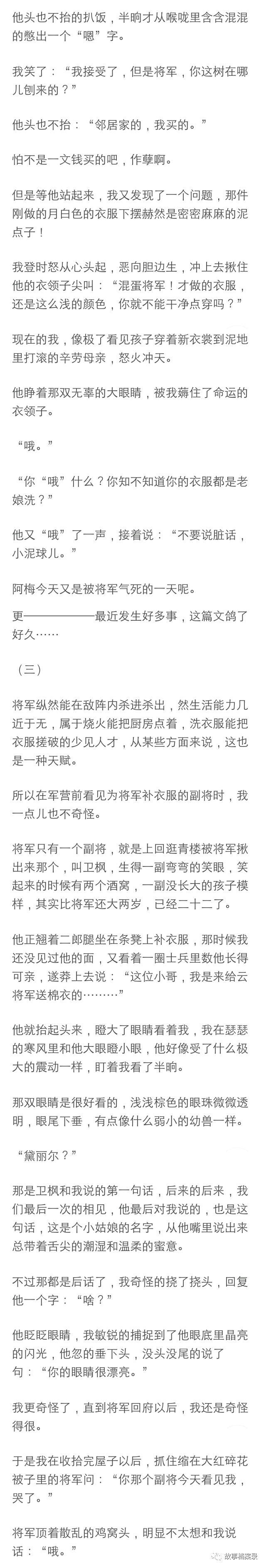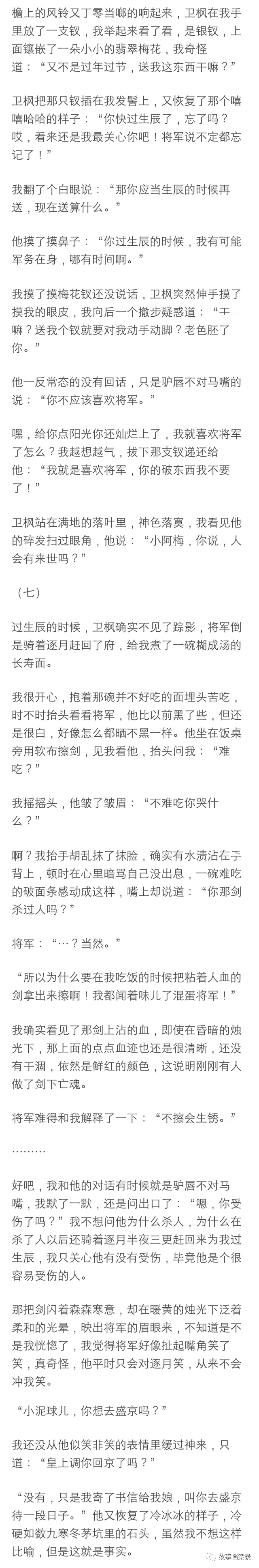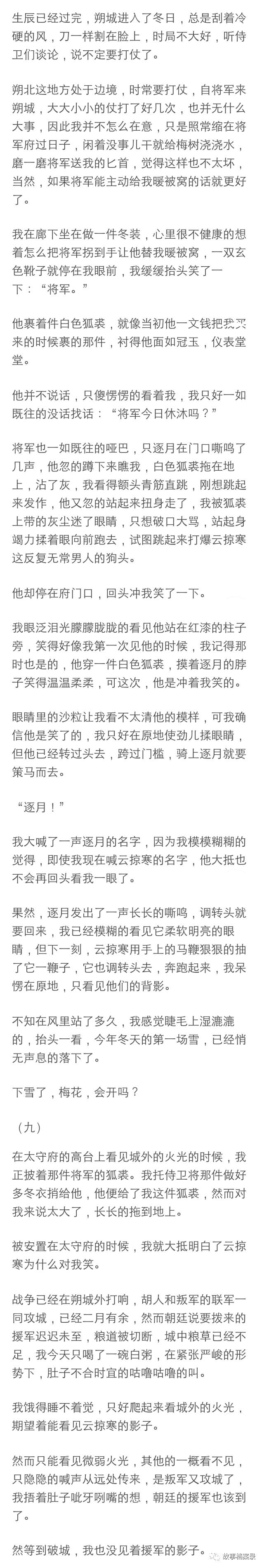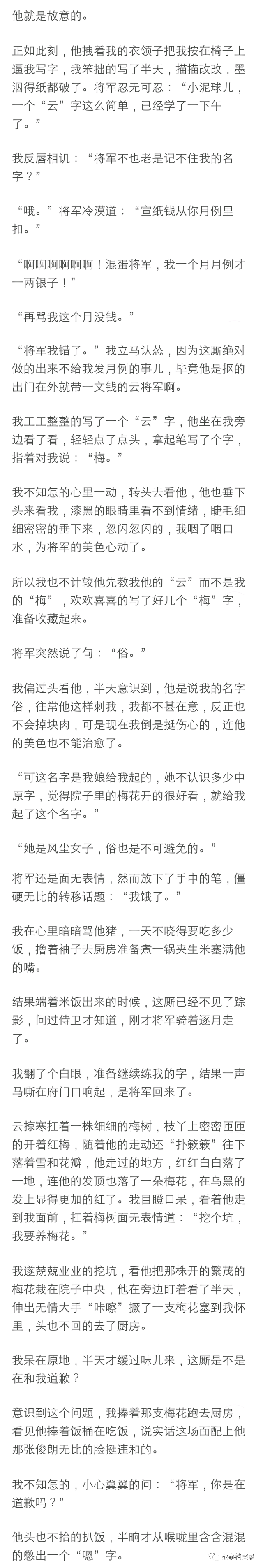 将军展露了我遇见他以来的第一个微笑,那笑容绝对生动明媚如春日桃花,但是不是对着我,是对着他的马,只见他深情款款的摸了摸那马的脖子, 转头对着我时又恢复了那冰山脸:“你把我的逐月压坏了怎么办?”