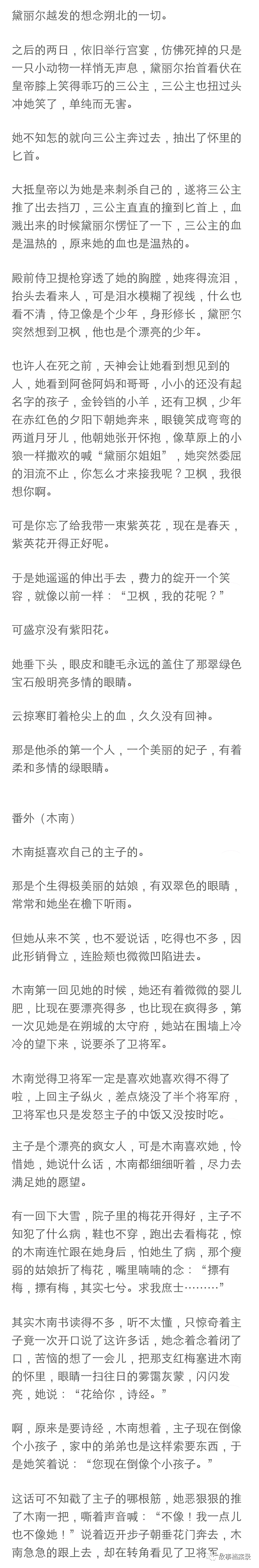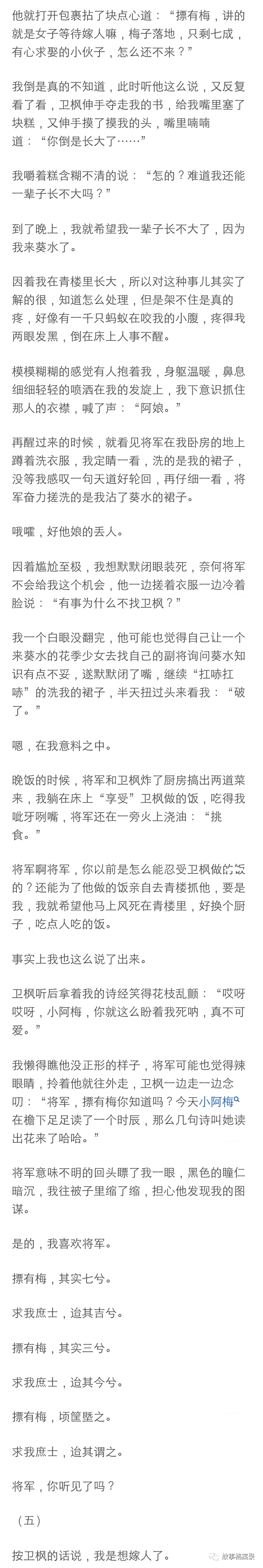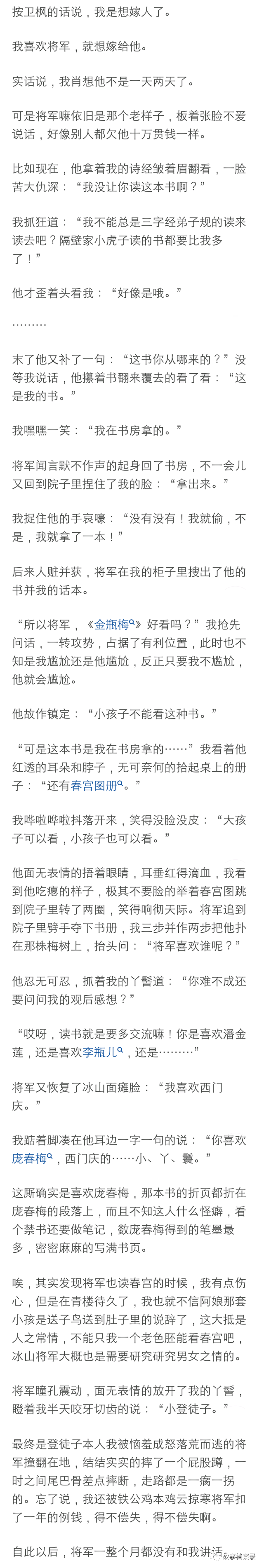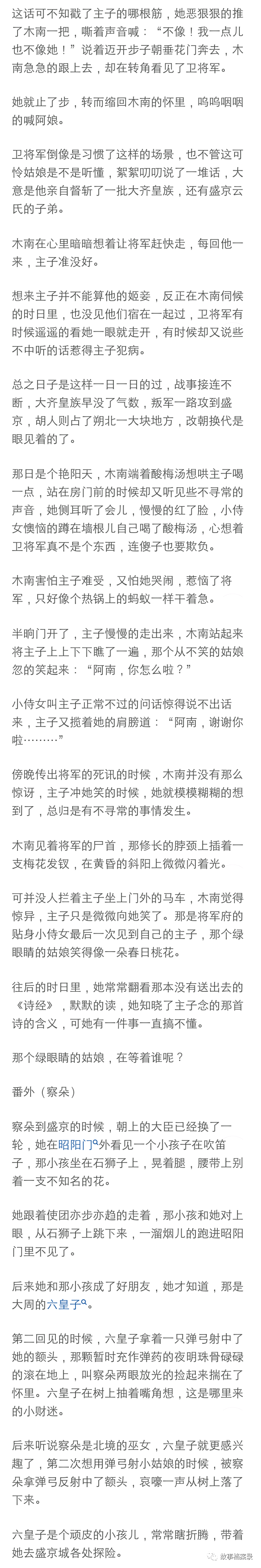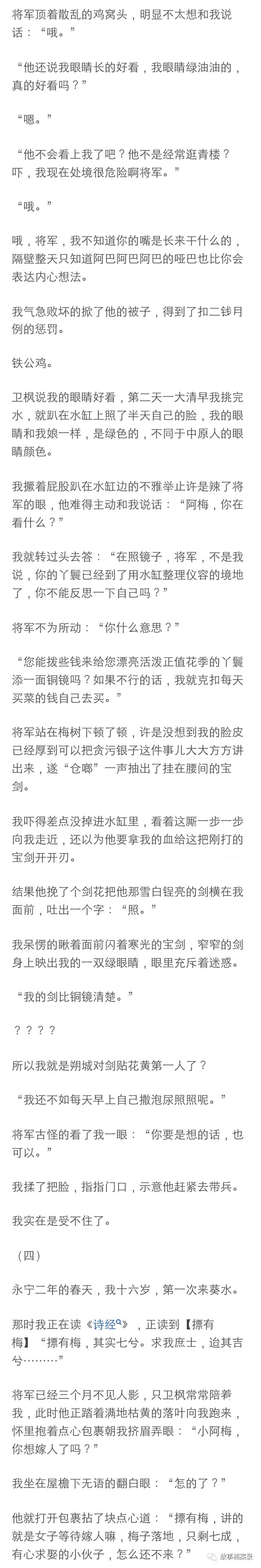 将军展露了我遇见他以来的第一个微笑,那笑容绝对生动明媚如春日桃花,但是不是对着我,是对着他的马,只见他深情款款的摸了摸那马的脖子, 转头对着我时又恢复了那冰山脸:“你把我的逐月压坏了怎么办?”