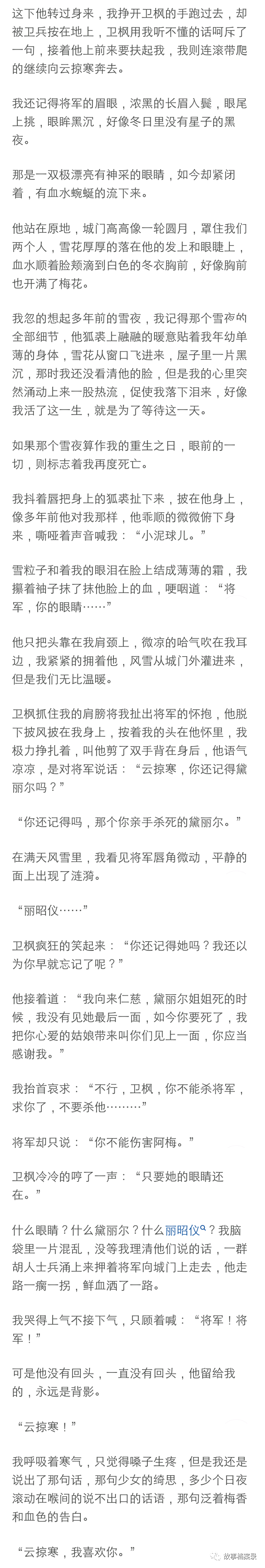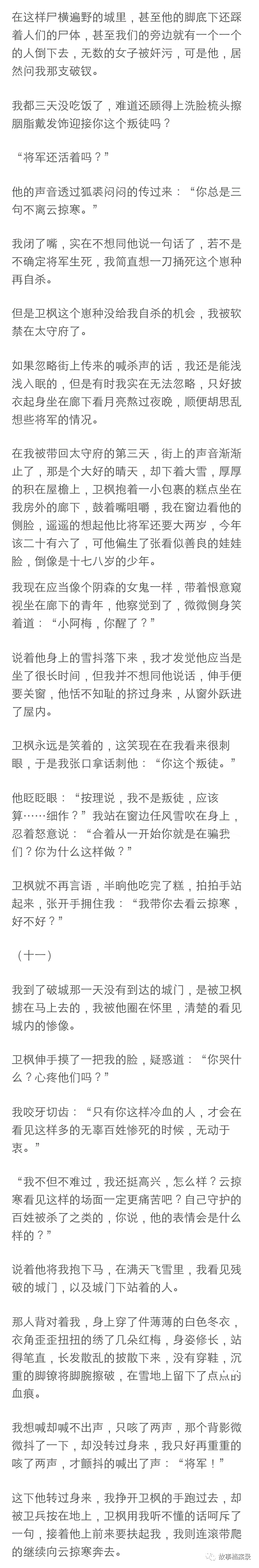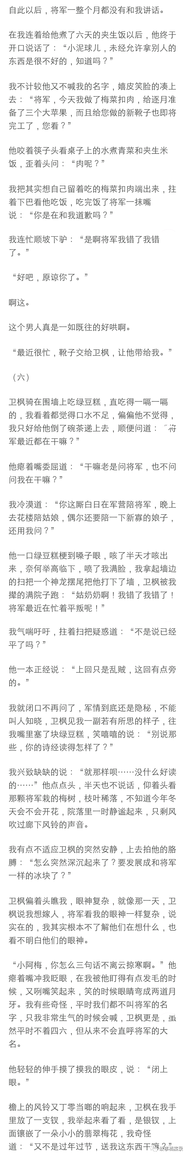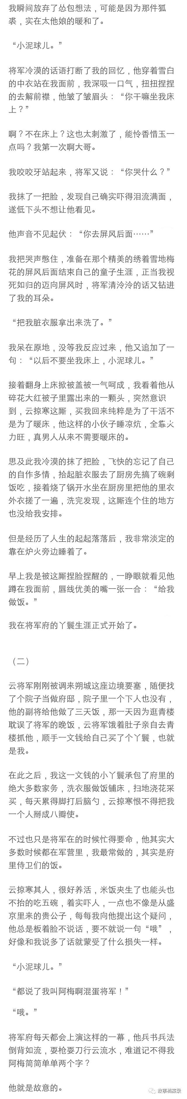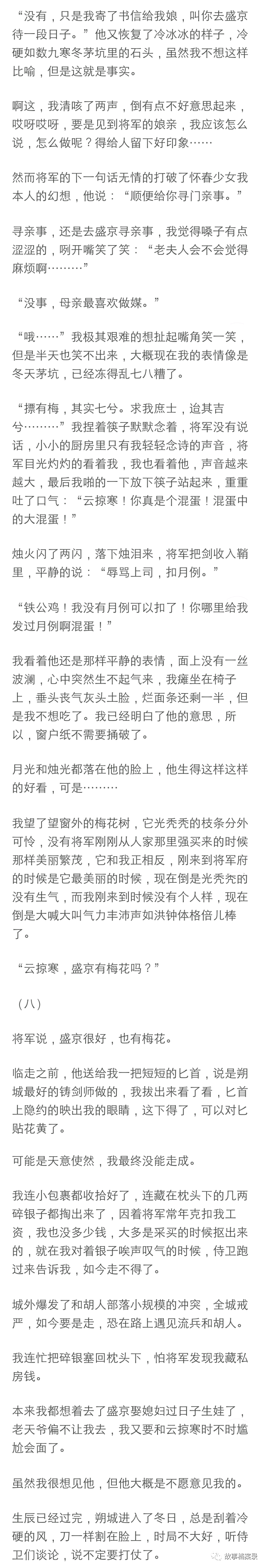 “一文钱,爱要不要,不要可以还我。最后我以一文钱的价格被卖给了云掠寒,他还顺走了楼里的一套女装给我套上了。我穿着那件粉色薄纱材质四处漏风的衣裳和他在雪地上走,云将军在前面牵着马裹着狐裘,背影修长高大,我扯扯嘴角, 看着他的侧脸想,长得倒很英俊,跟着也不算亏,反正总比在青楼里好,就是不知道有没有夫人......