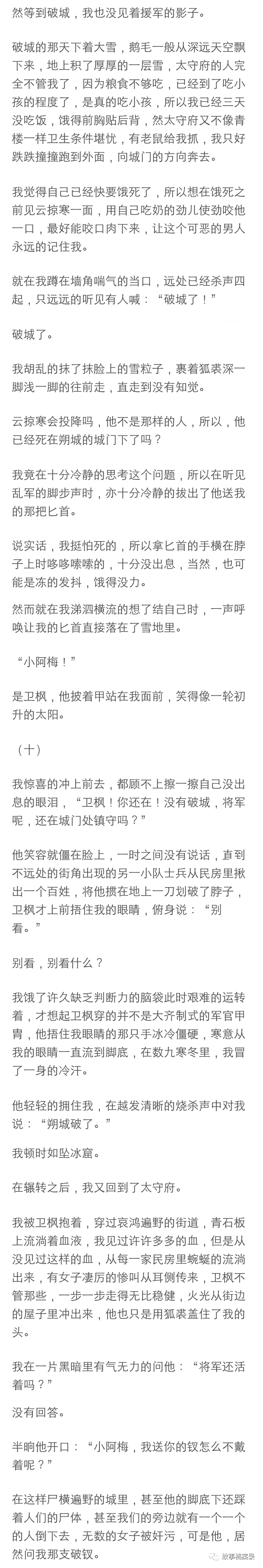 如果忽略我发抖的双腿的话,我还是能称得上是淡定的,说实话,虽然从小在楼里长大,但是我还从来没经历过这种事,长到十三岁要接客,我不愿意,被打了一顿扒了衣服饿了三天,吃那只死老鼠的时候我很动摇,刚想喊两声叫老鸨给我拿两只烧鸡来,我去接十个客都行,云将军就破门而入把他那雪白雪白的狐裘披到了我身上。