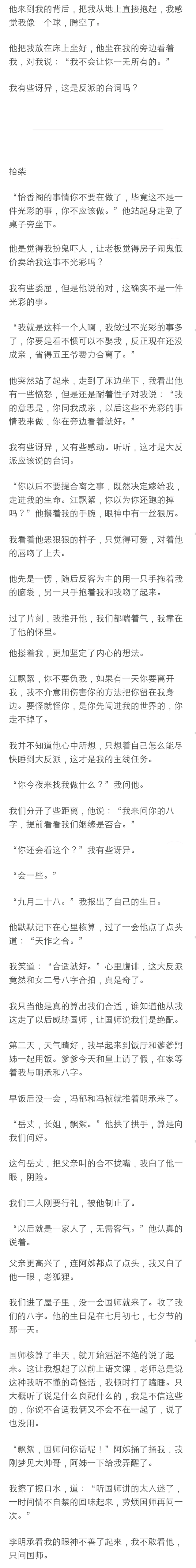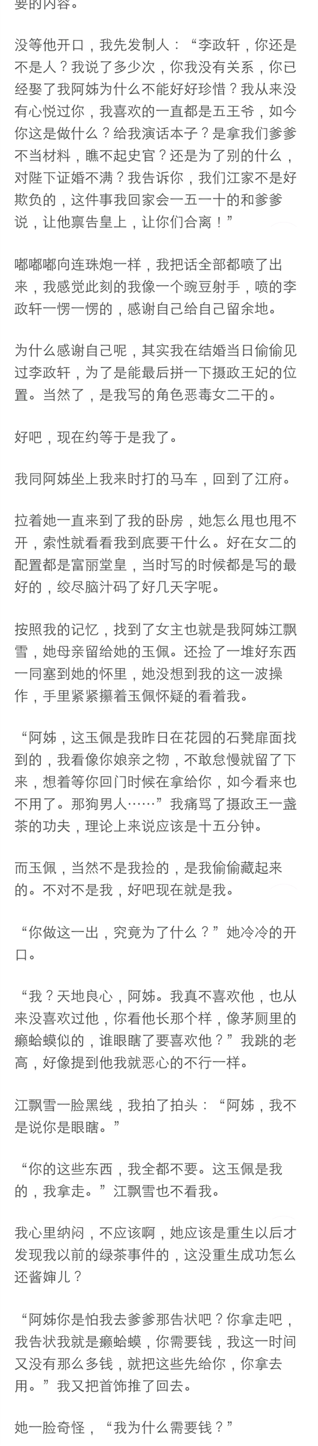 第二天,摄政王喊我名字的事情就传遍了整个京城。想来阿姊和摄政王的争吵激烈,被摄政王府的下人传了出来。而阿姊,毕竟是我笔下的女主,怎么能容忍自己的男人心里有别的女人,第二天就要和摄政王合离,摄政王不同意,两人在摄政王府门口又开始大吵。