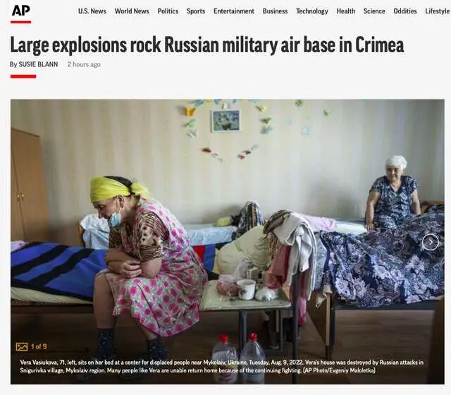 在南线战场,8月9日下午3点20分左右(基辅时间),克里米亚萨基市的一个俄罗斯空军基地发生了一系列的爆炸,有目击者称,数十起爆炸导致机场跑道着火,附近的房屋也受到了损坏。