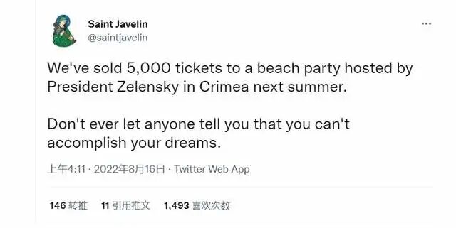 而乌克兰一个团体(“神圣标枪导弹教团”)随即在社交媒体上表示,他们已经预售了5000张明年夏天在克里米亚和泽连斯基一起举办泳池派对的门票。