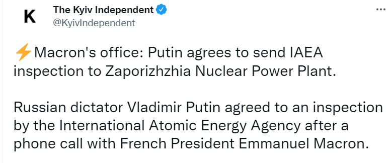 在马克龙打电话和普京“亲切交谈”了几个小时后,普京表示愿意让国际原子能机构派人到扎波罗热核电站。