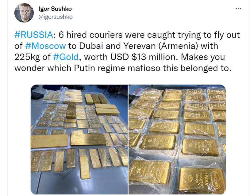 在莫斯科飞往亚美尼加等地的航班出发前,有6名受雇佣带着225公斤(价值1千3百万美元)黄金出境的人员被抓获。
