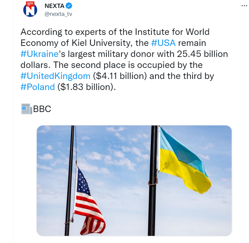 各国对乌克兰捐款的排名又更新了,美国继续以254.5亿美元的军事援助排名第一,英国的41亿美元排到第二,而波兰则以18.3亿美元排到第三。