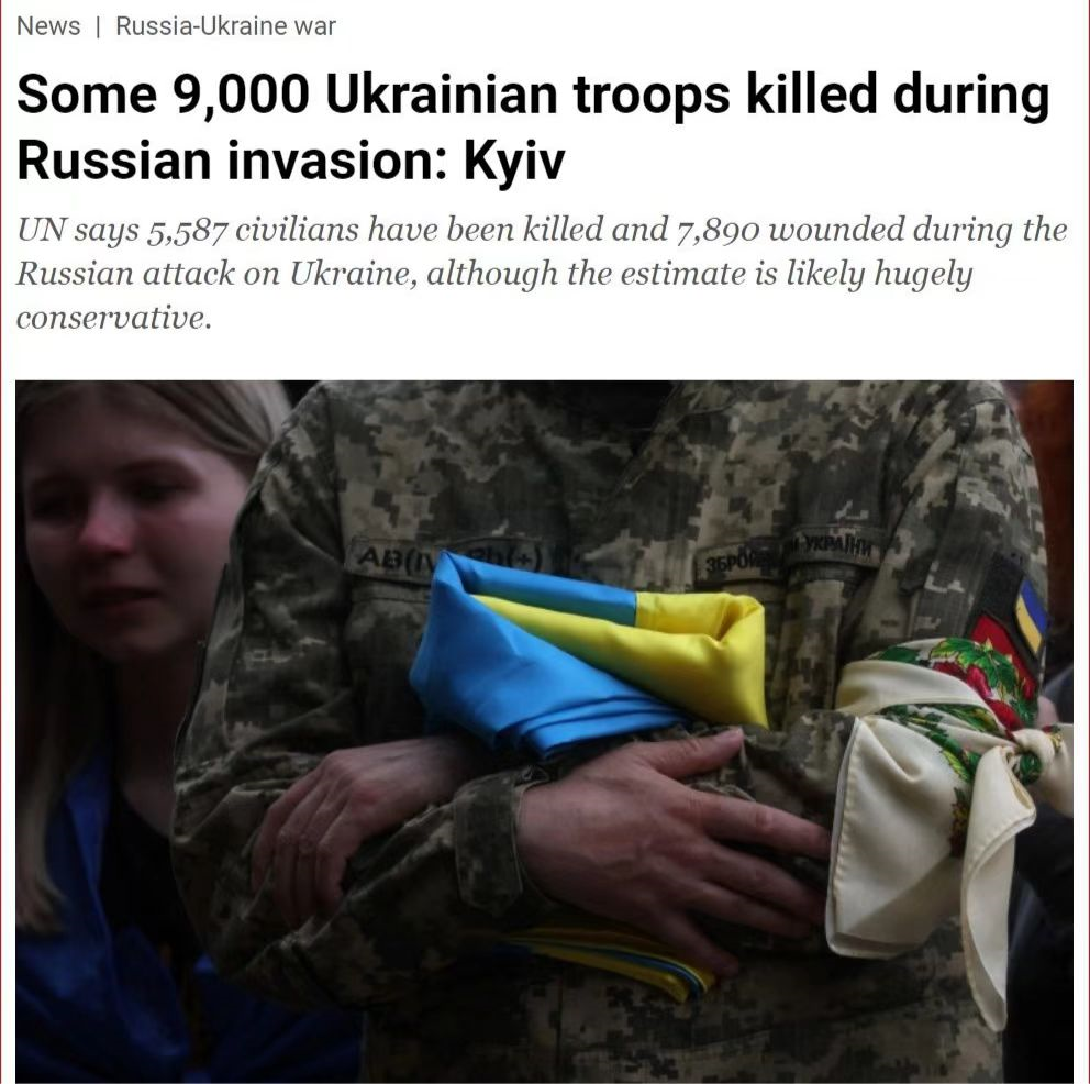 根据乌克兰国防部的报告,自俄罗斯对乌克兰的入侵近六个月以来,已经有约9000名乌克兰士兵阵亡。