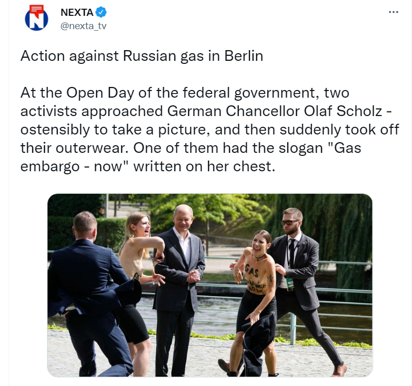 三、德国的两名小姐姐在舒尔茨发表讲话时,突然冲到他面前脱掉上衣,露出”禁运俄罗斯天然气“的标语。