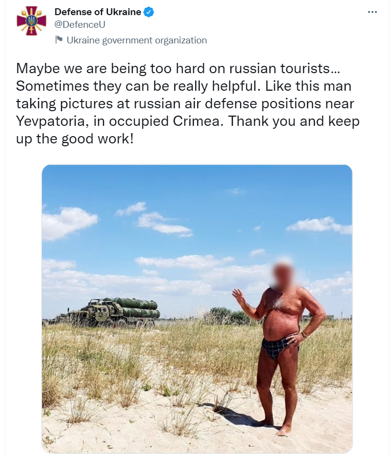 二、乌克兰国防部在社交媒体发文,感谢俄罗斯游客帮助他们发现了克里米亚的俄军军军事目标。