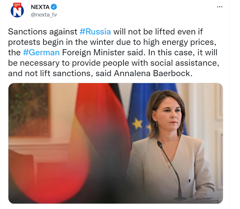 几天前,德国外长贝尔伯克在布拉格举行的一个会议上表示,就算冬天到来后,一部分德国人抗议能源价格上涨,德国也不会停止对俄罗斯的制裁。